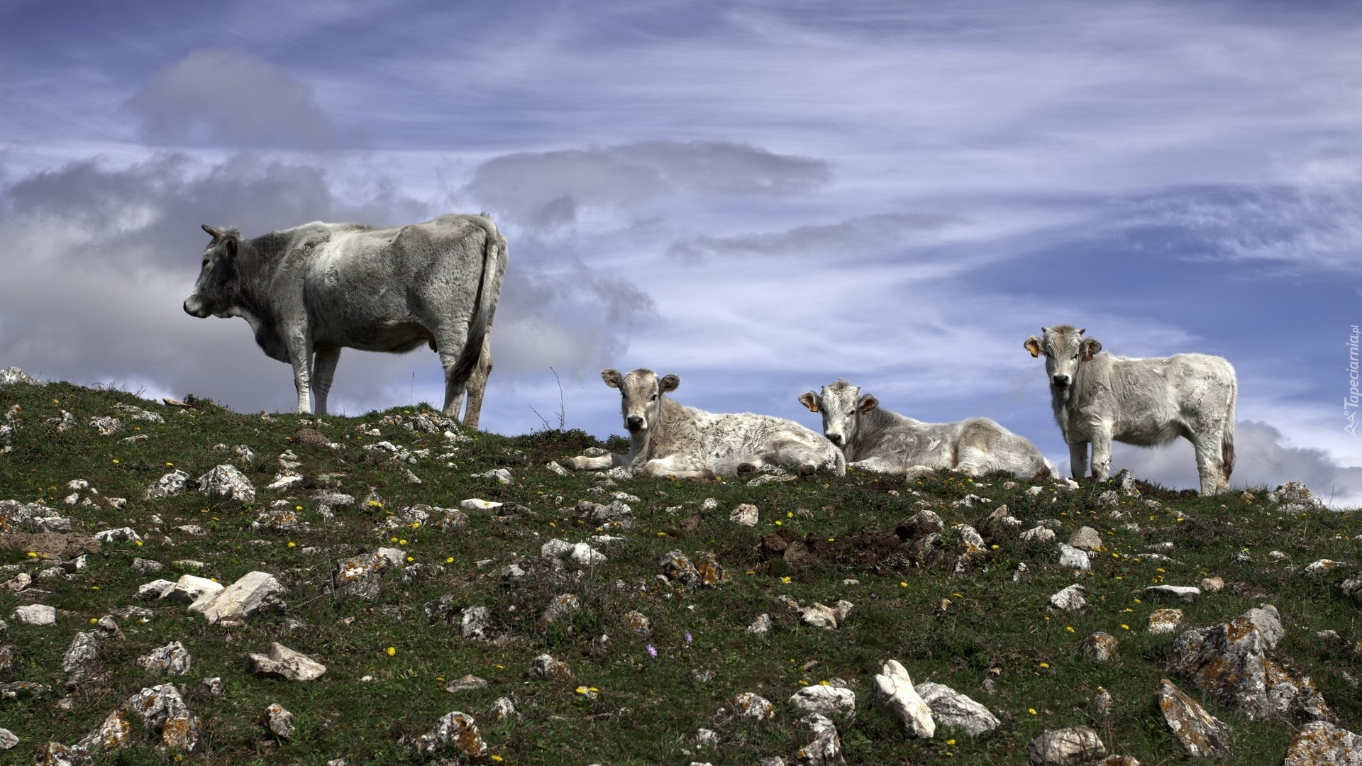 Edytor tapety: Cztery, Szare, Krowy, Pastwisko, Kamienie