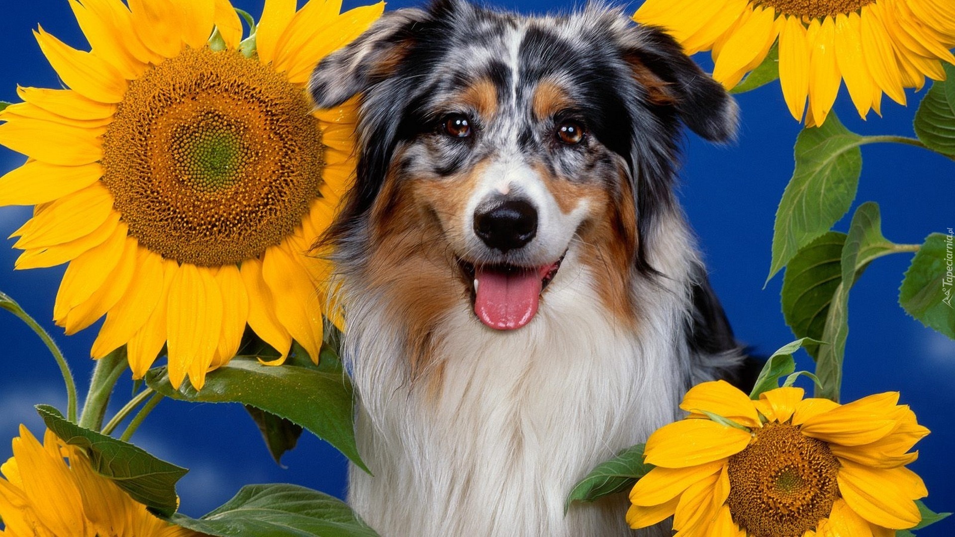 Edytor tapety: Słoneczniki, Owczarek australijski, Australian shepherd