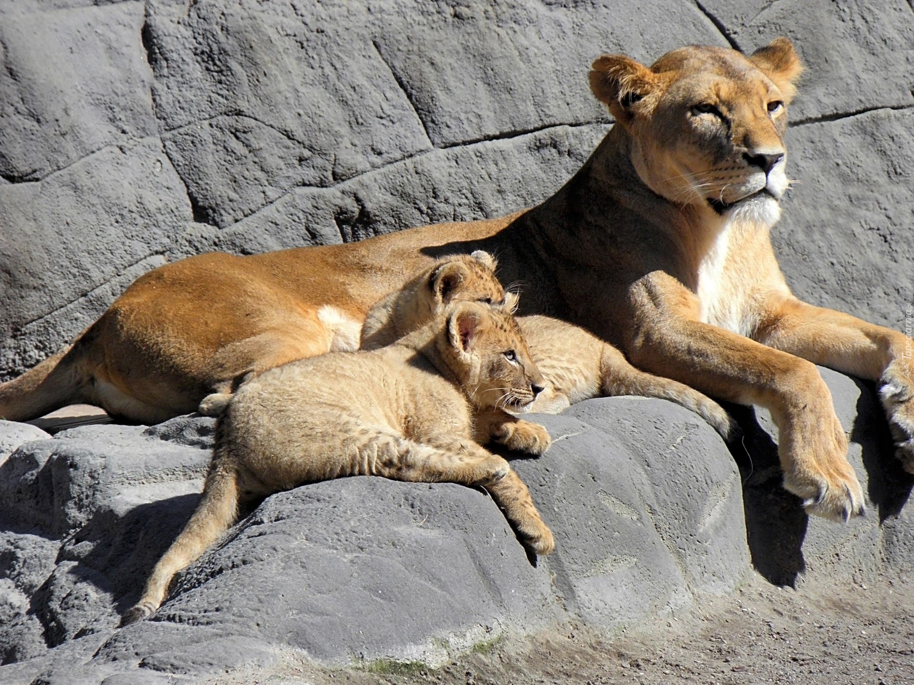 Edytor tapety: Lwica, Młode, Skała, Odpoczynek