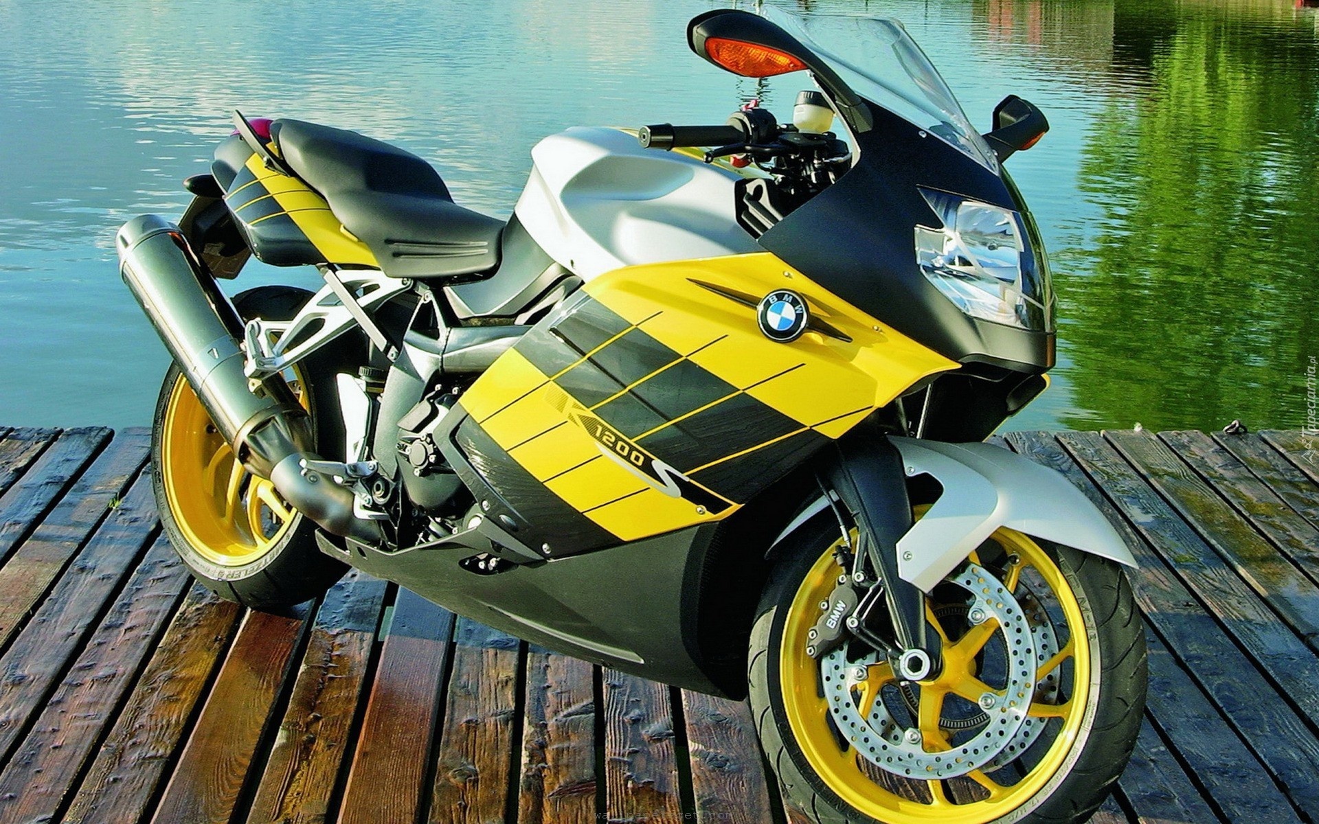 Edytor tapety: Żółty, Motocykl, BMW, Jezioro