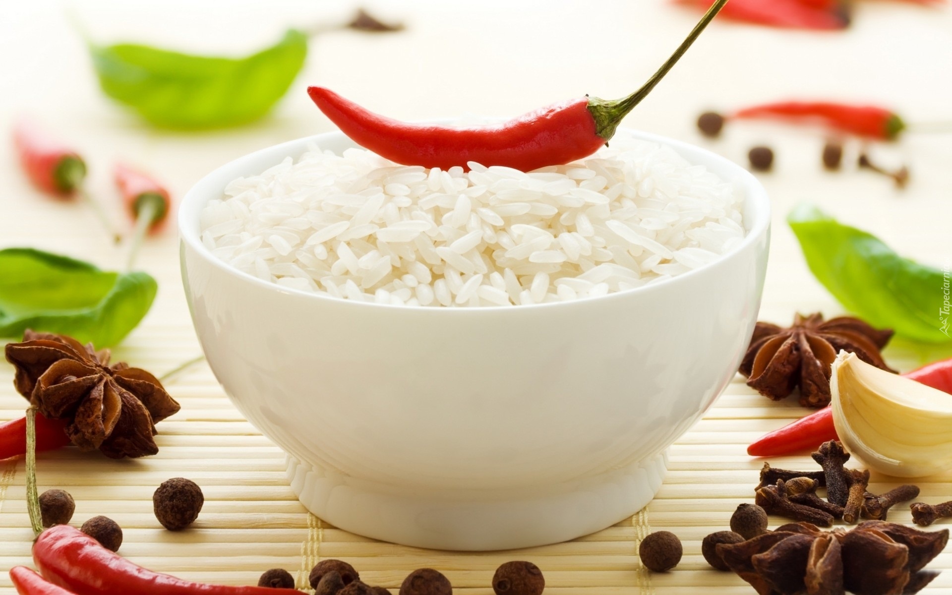 Edytor tapety: Miseczka, Ryżu, Papryczka, Przyprawy