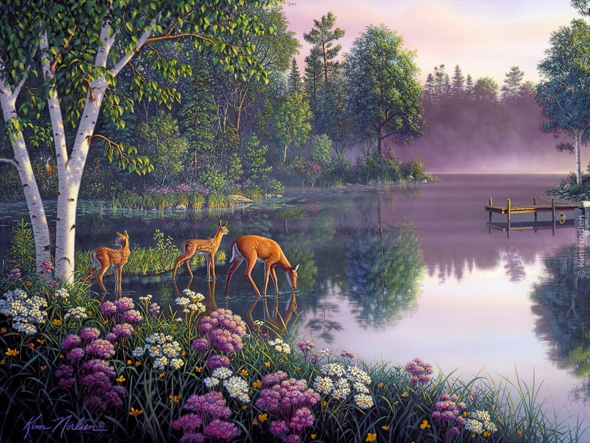 Edytor tapety: Widoczek, Sarny, Kwiaty, Las, Jezioro, Malarstwo, Kim Norlien