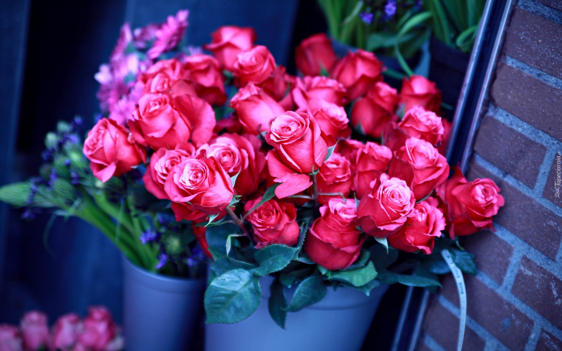 Edytor tapety: Różowe, Róże, Kubełek, Ściana