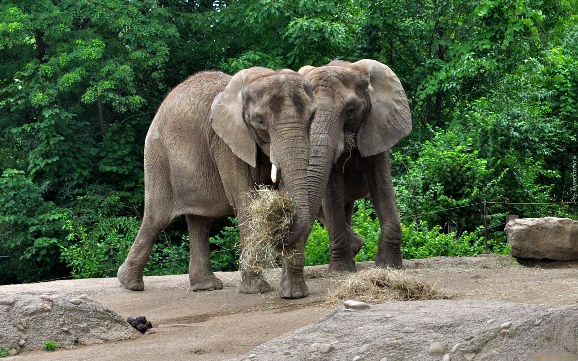 Edytor tapety: Dwa, Słonie, Wtulone, Siano, Drzewa