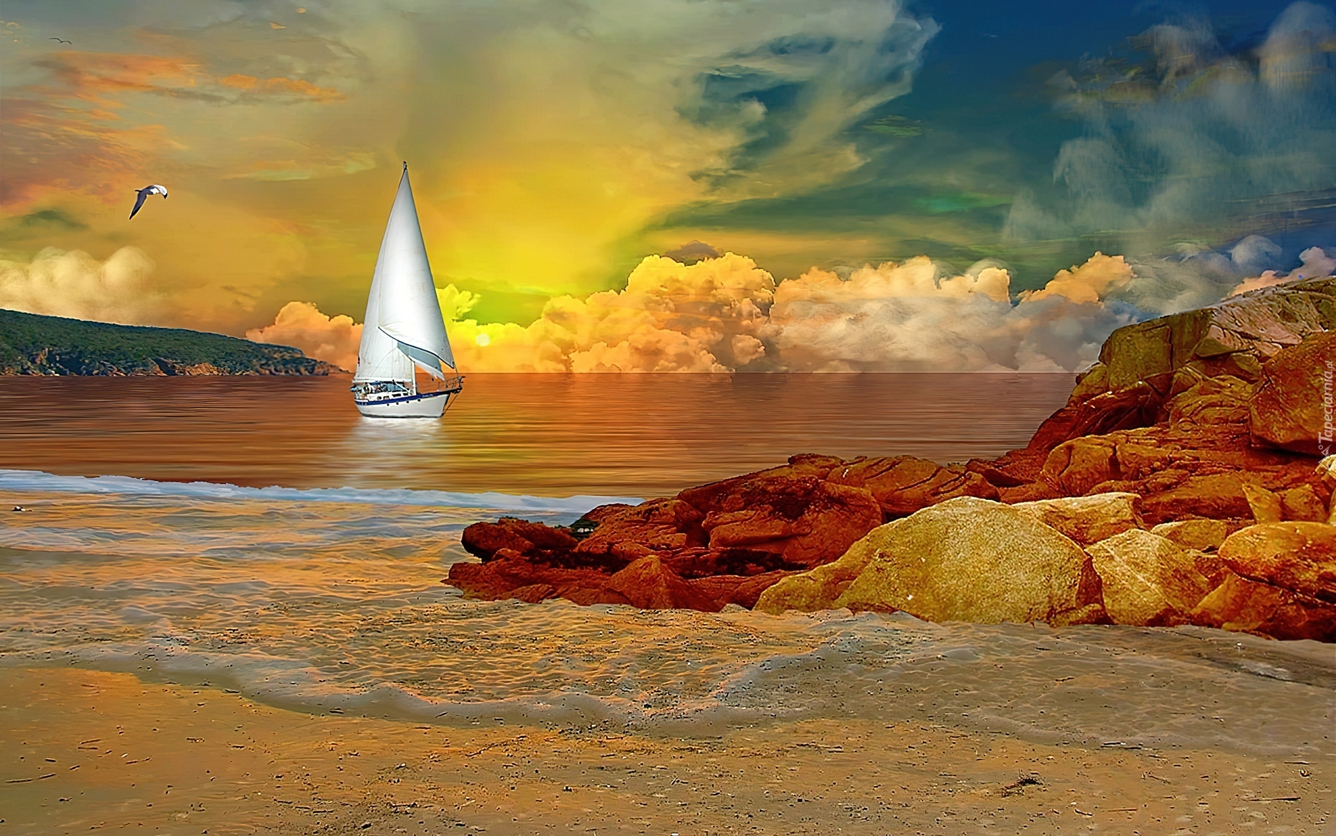 Edytor tapety: Żaglówka, Zachód, Słońca, Skały Morze, Niebo