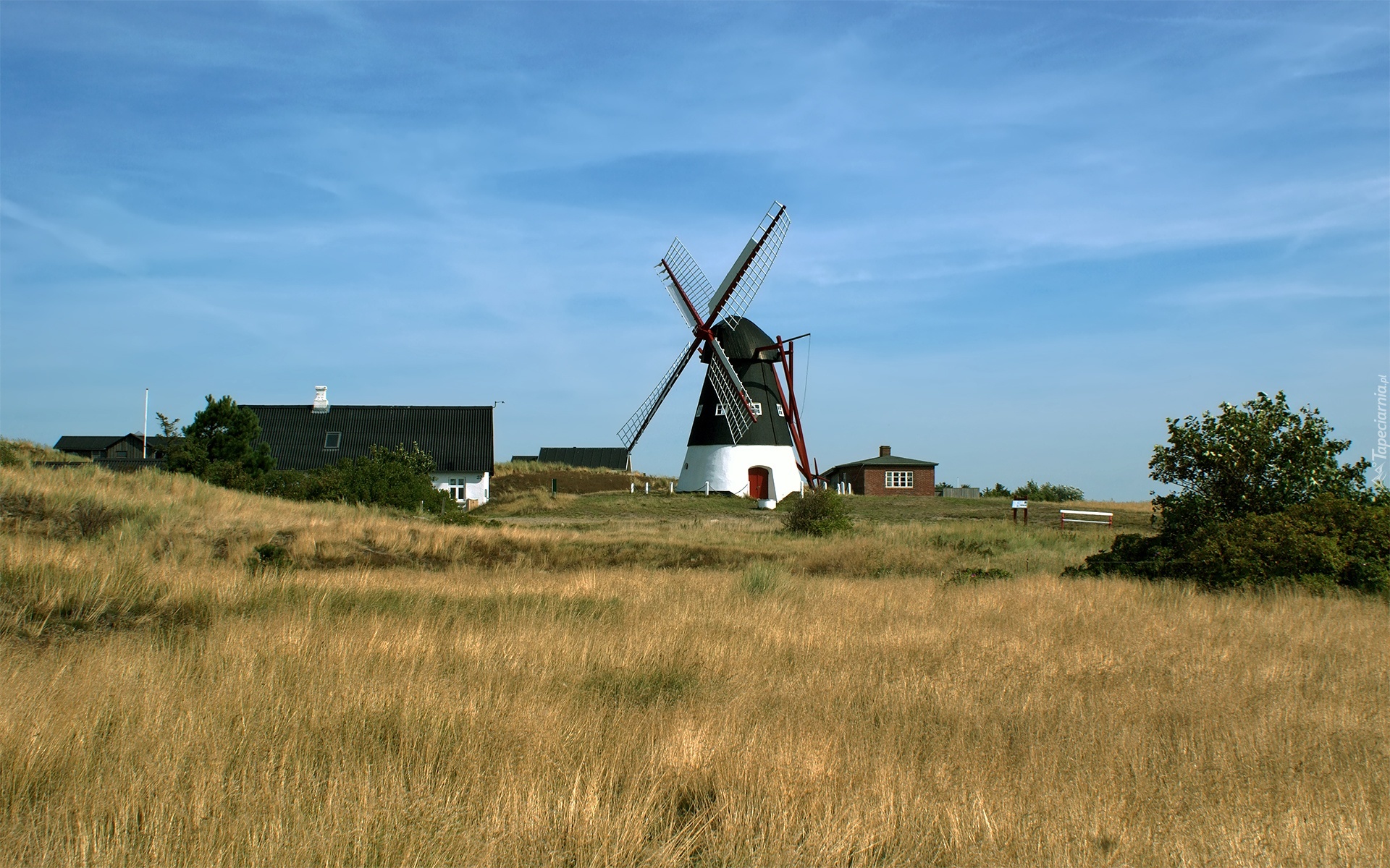 Edytor tapety: Łąka, Drzewa, Budynki, Wiatrak, Niebo