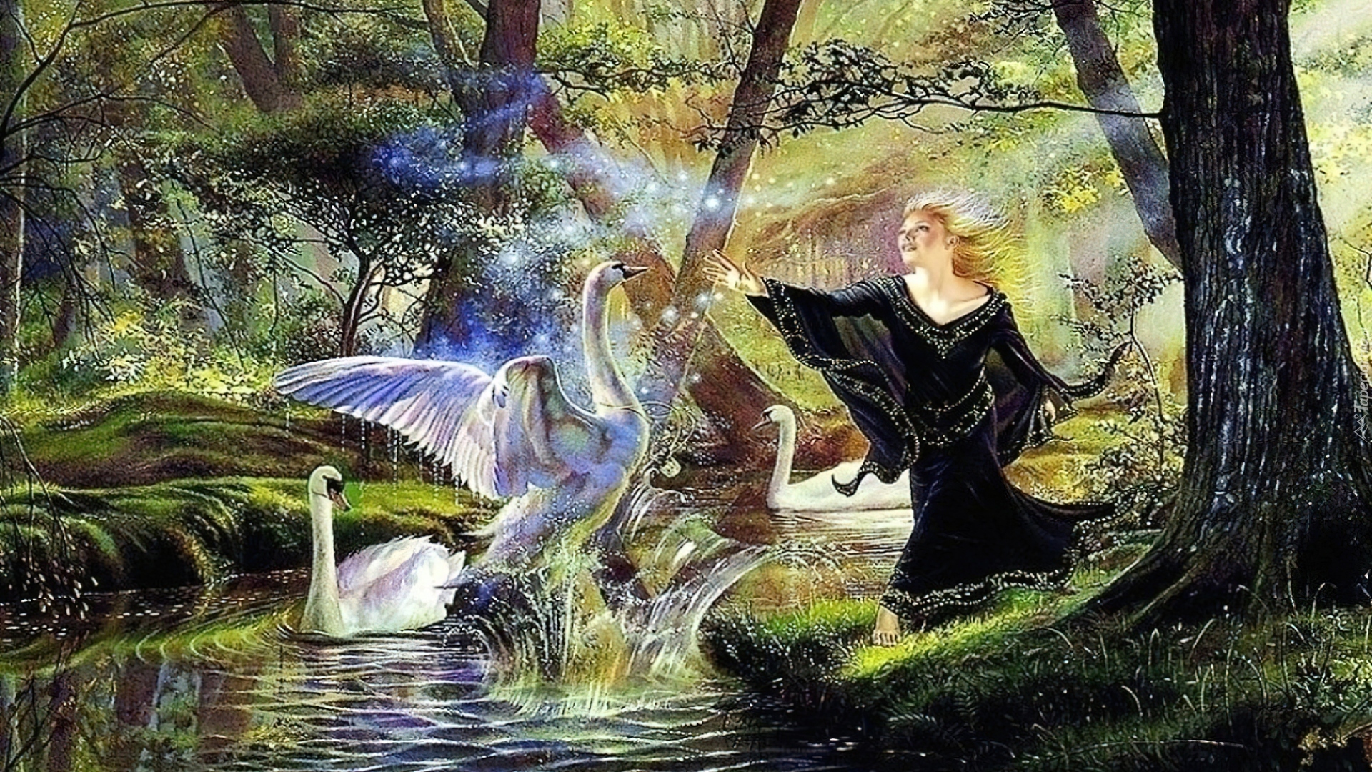 Edytor tapety: Kobieta, Łabędzie, Las, Rzeka