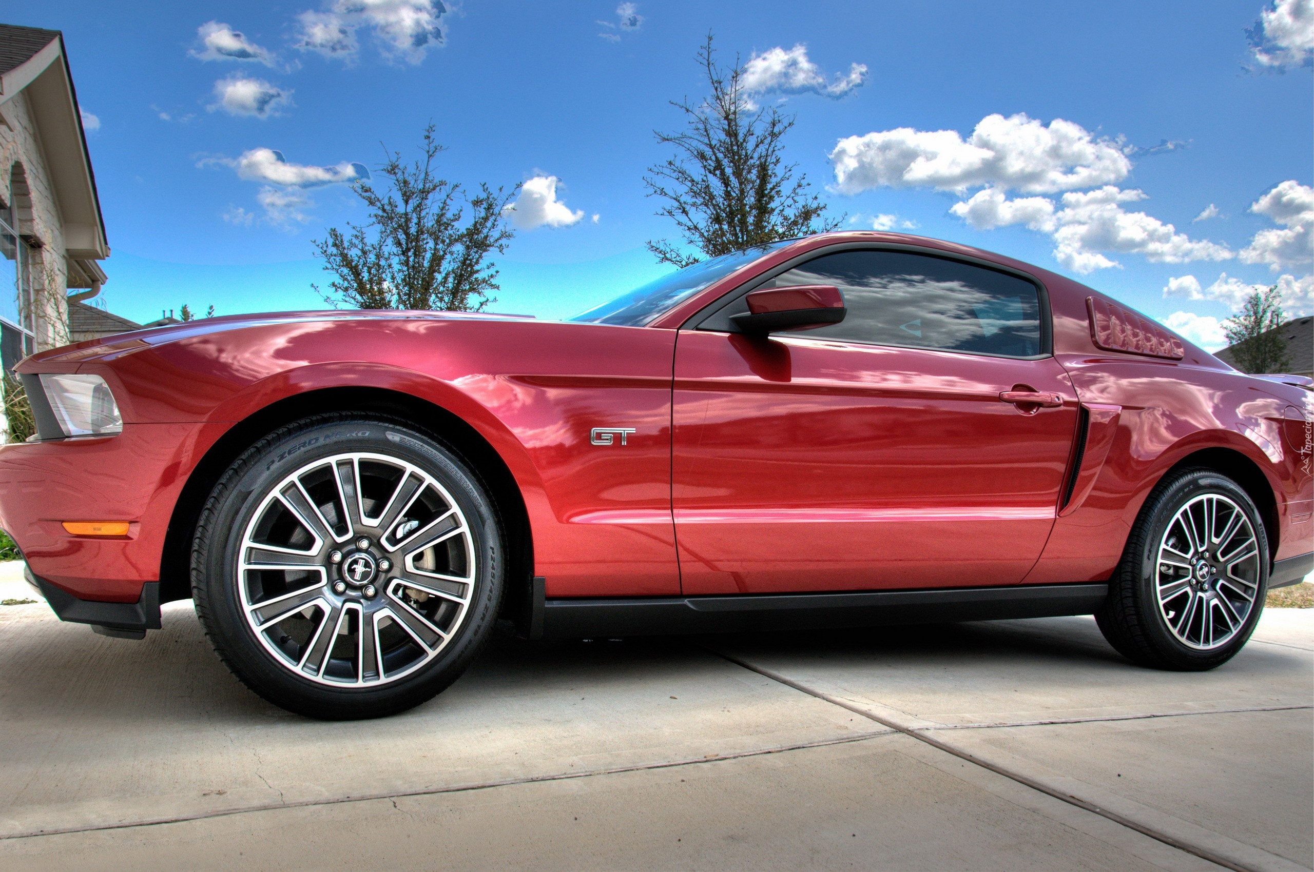 Edytor tapety: Czerwony, Ford, Mustang GT, Plac, Niebo, Chmury