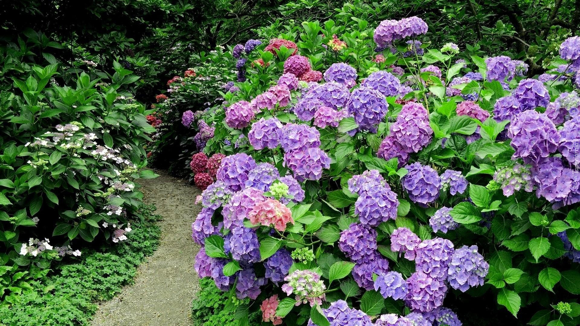 Edytor tapety: Ogród, Dróżka, Kwiaty, Hortensje
