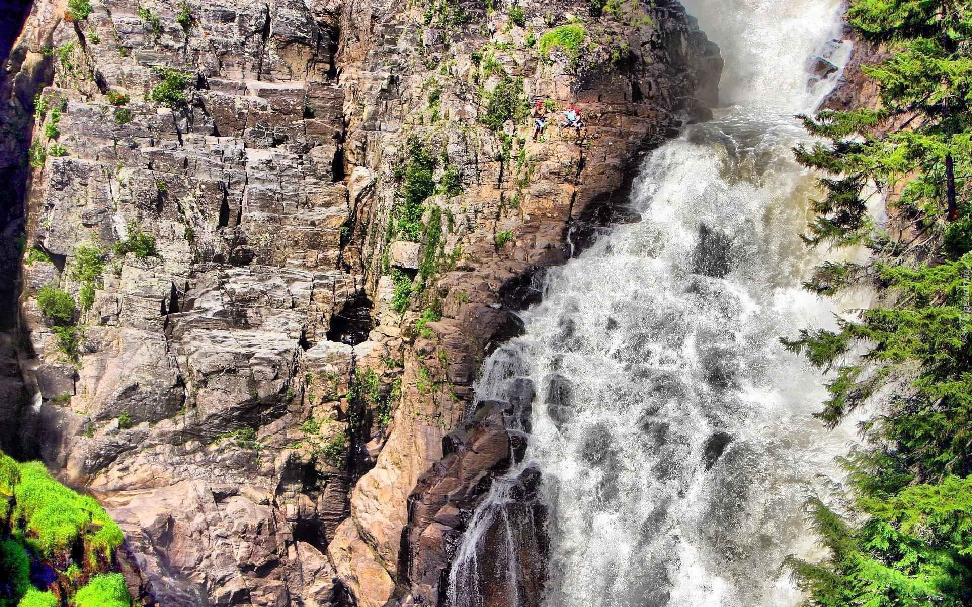 Edytor tapety: Wodospad, Skały, Drzewo, Alpiniści