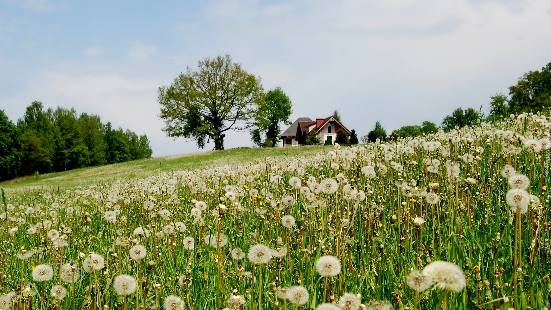 Edytor tapety: Łąka, Dmuchawce, Drzewa, Domek