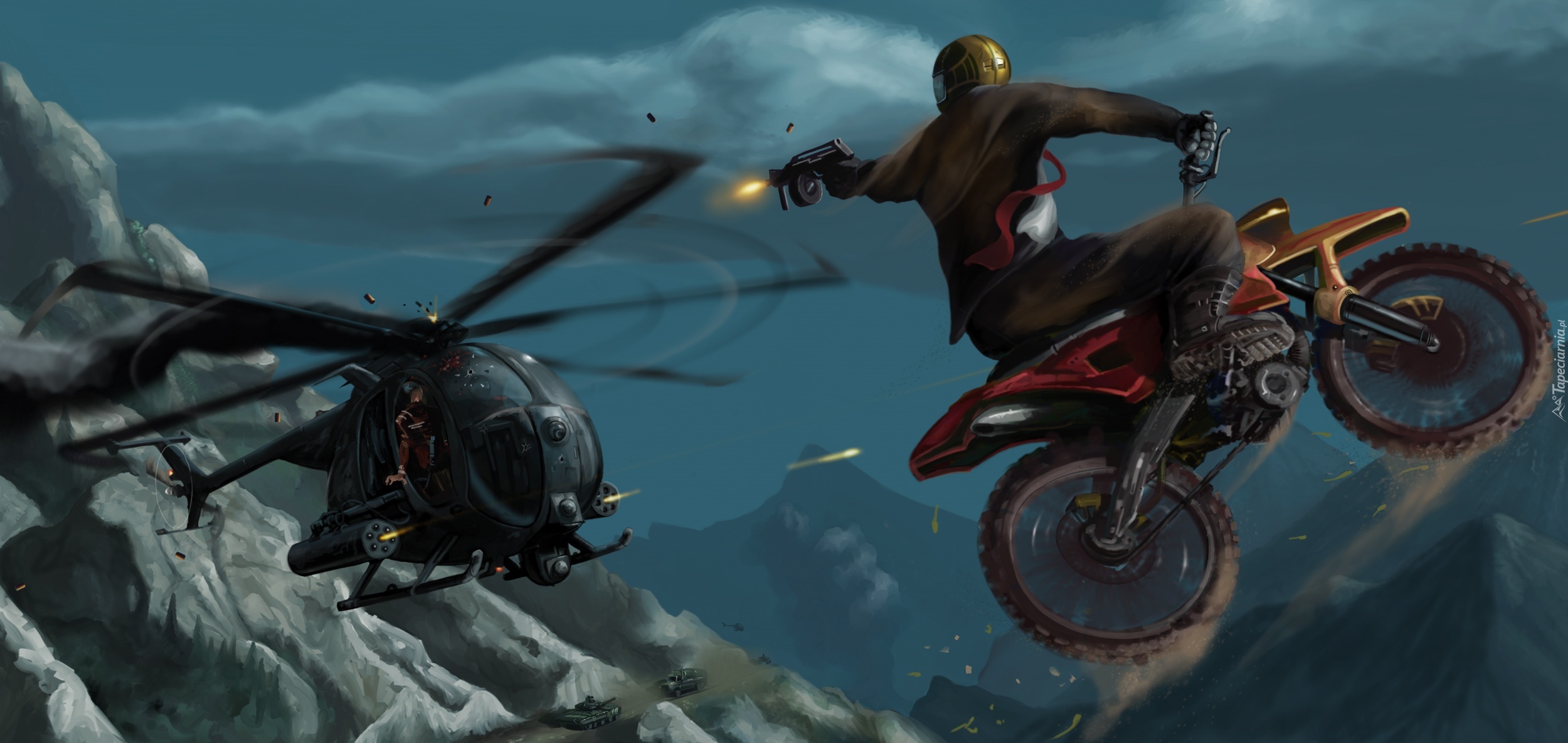 Edytor tapety: Wojownicy, Helikopter, Motocykl, Ostrzał
