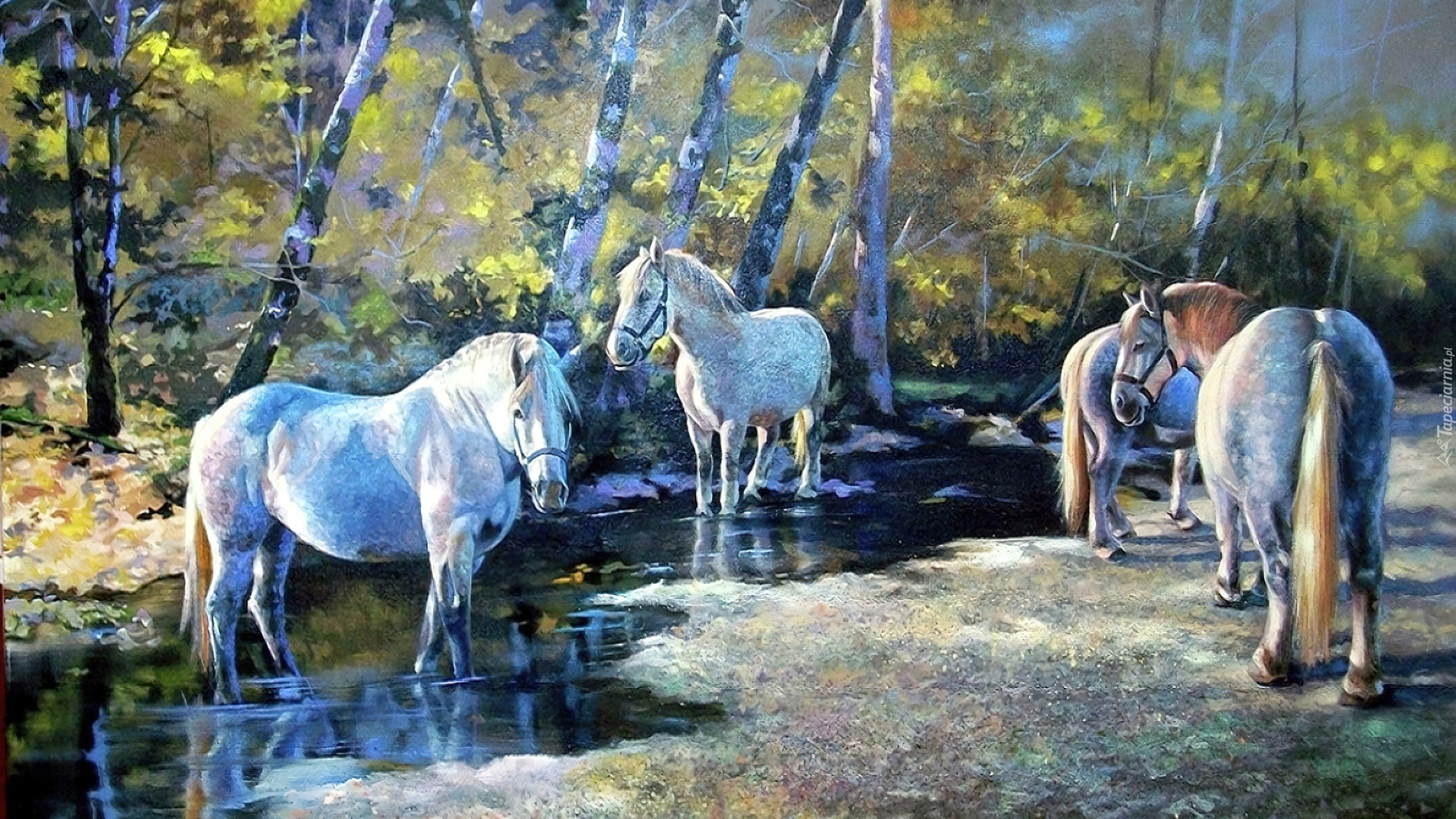 Edytor tapety: Konie, Rzeka, Las, Obraz