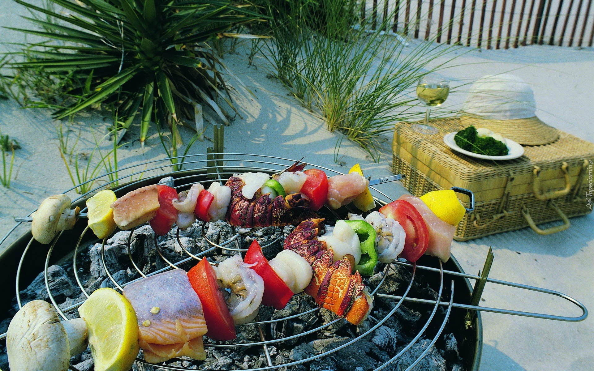 Edytor tapety: Szaszłyki, Grill, Walizka, Owoce Morza