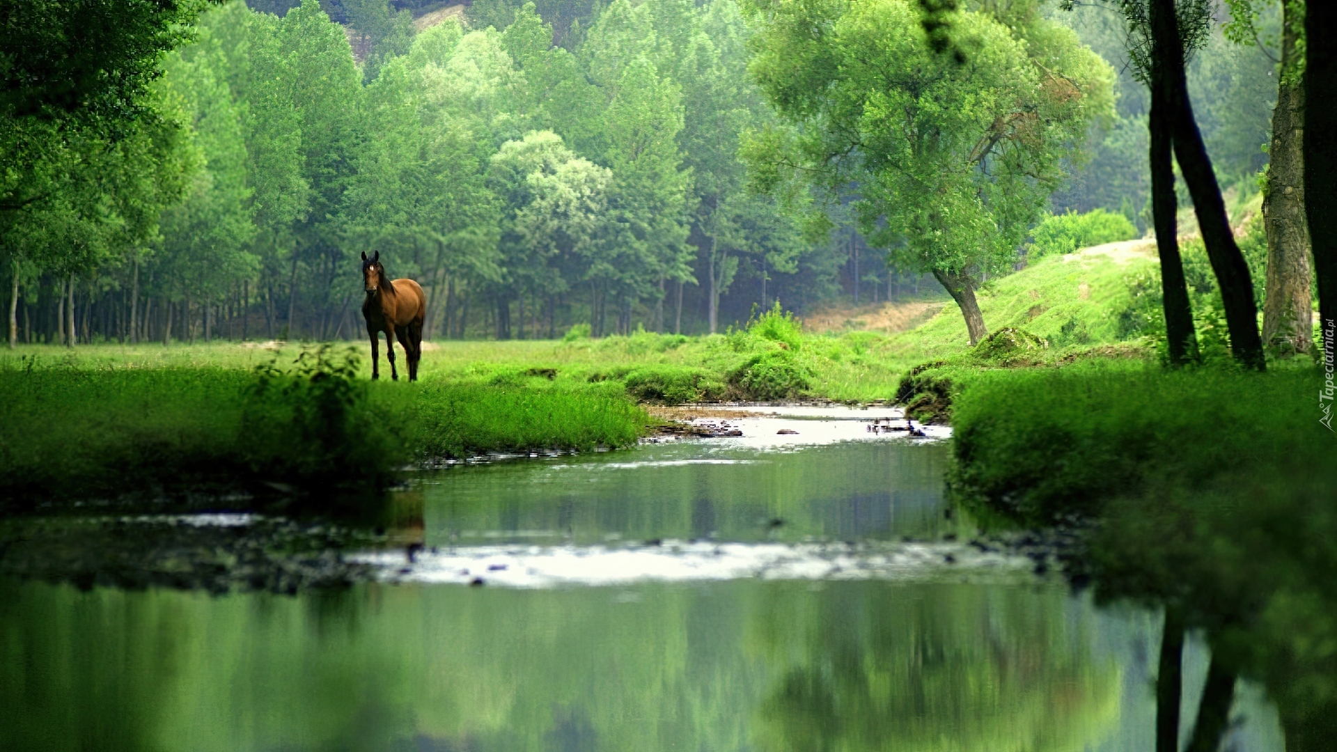 Edytor tapety: Koń, Las, Rzeka