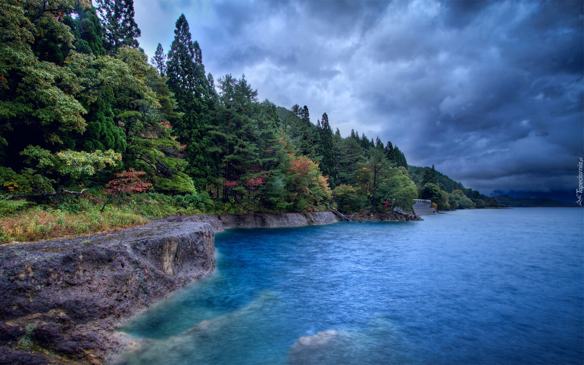 Edytor tapety: Jezioro, Drzewa, Skały, Pochmurne, Niebo