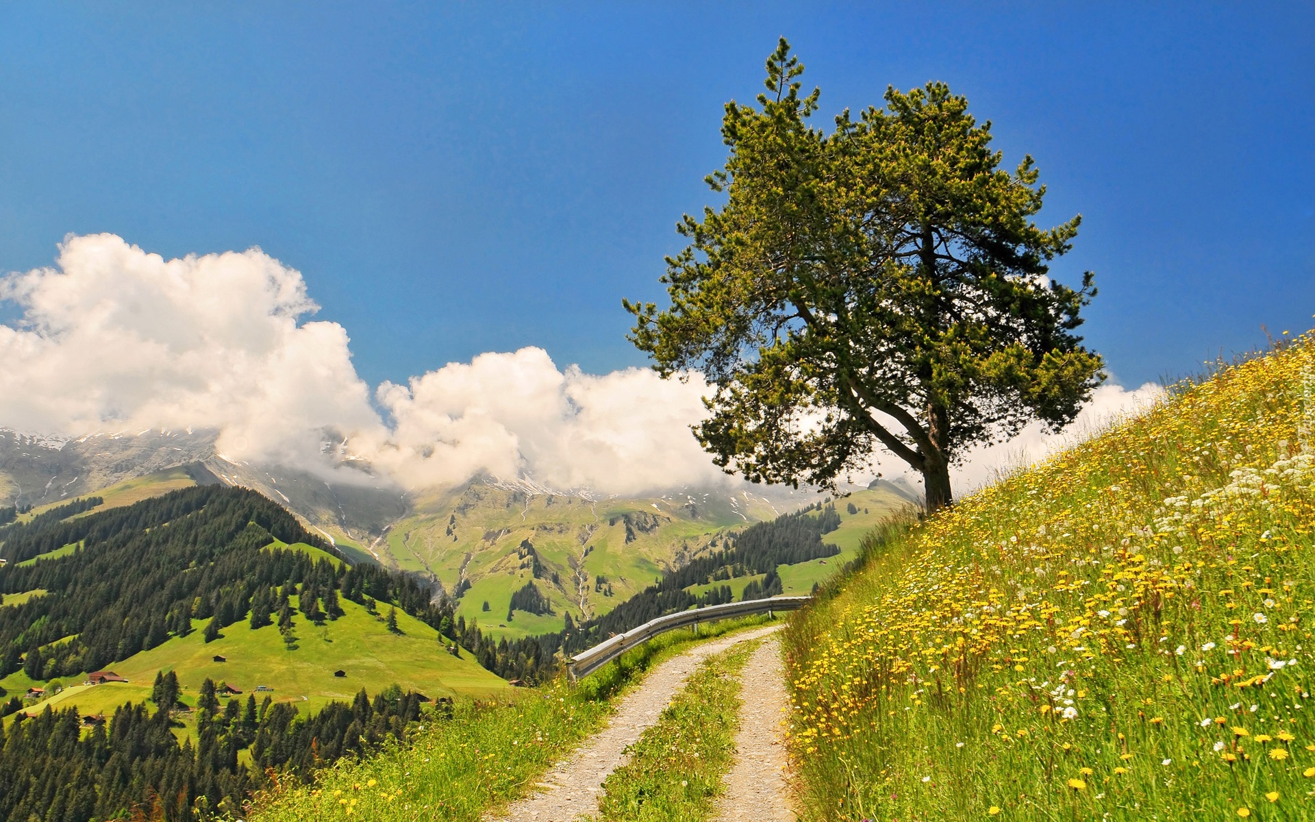 Edytor tapety: Polna, Droga, Drzewo, Wzgórza