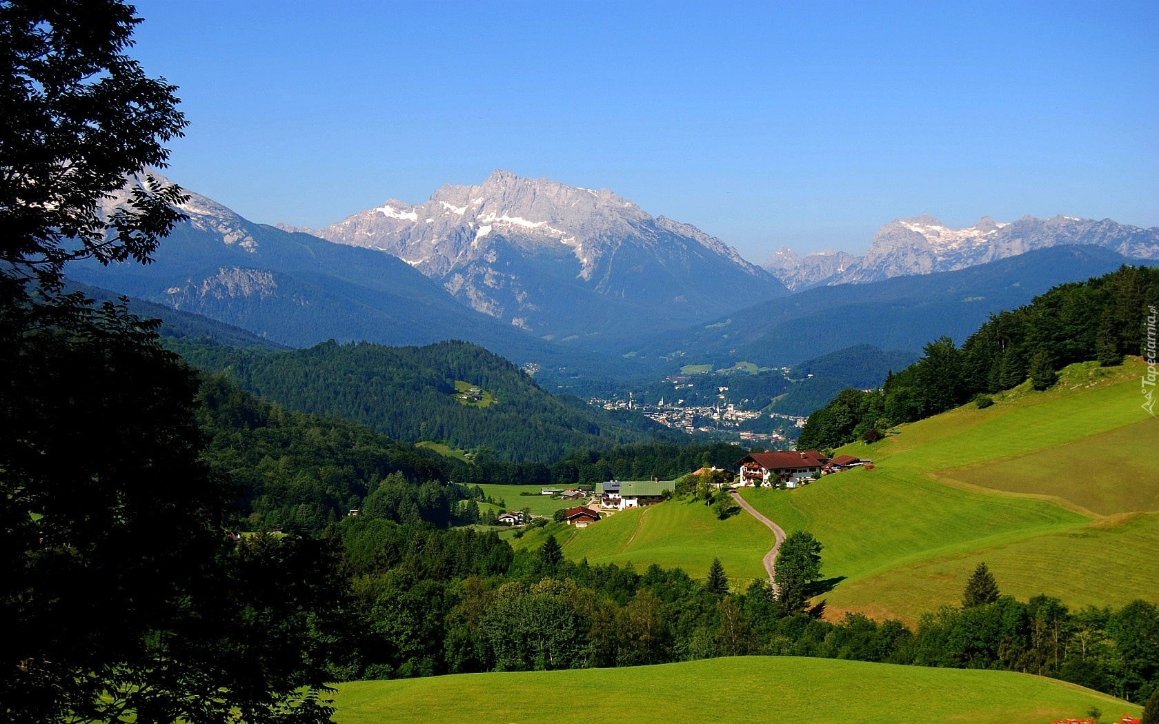 Edytor tapety: Góry, Miasteczko, Łąki, Drzewa
