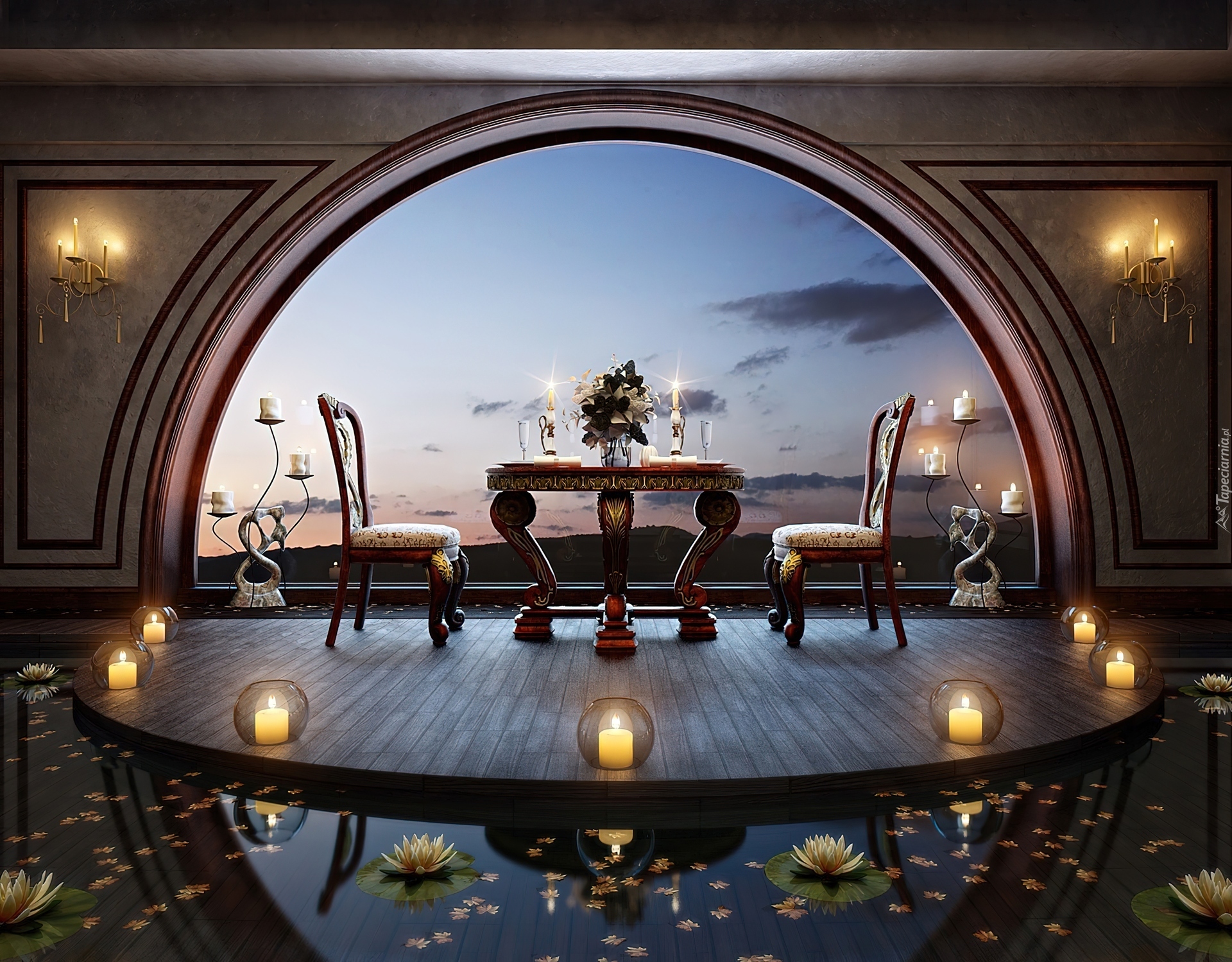 Edytor tapety: Pomieszczenie, Krzesła, Stół, Bukiet, Okno, Lilie, Woda