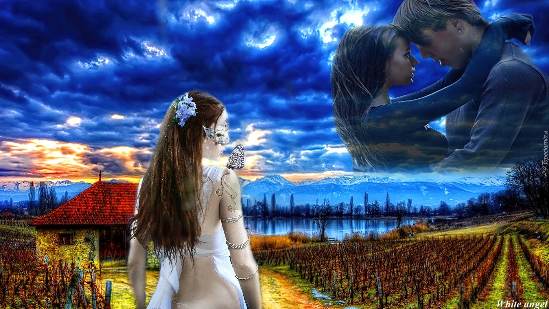 Edytor tapety: Para, Góry, Kobieta, Motyl