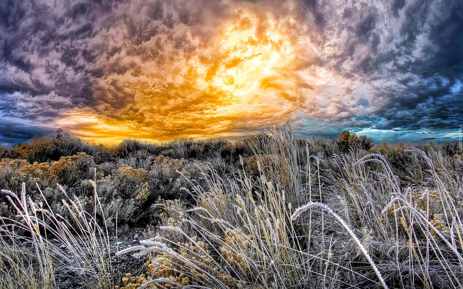 Edytor tapety: Zachód, Słońca, Chmury, Trawy