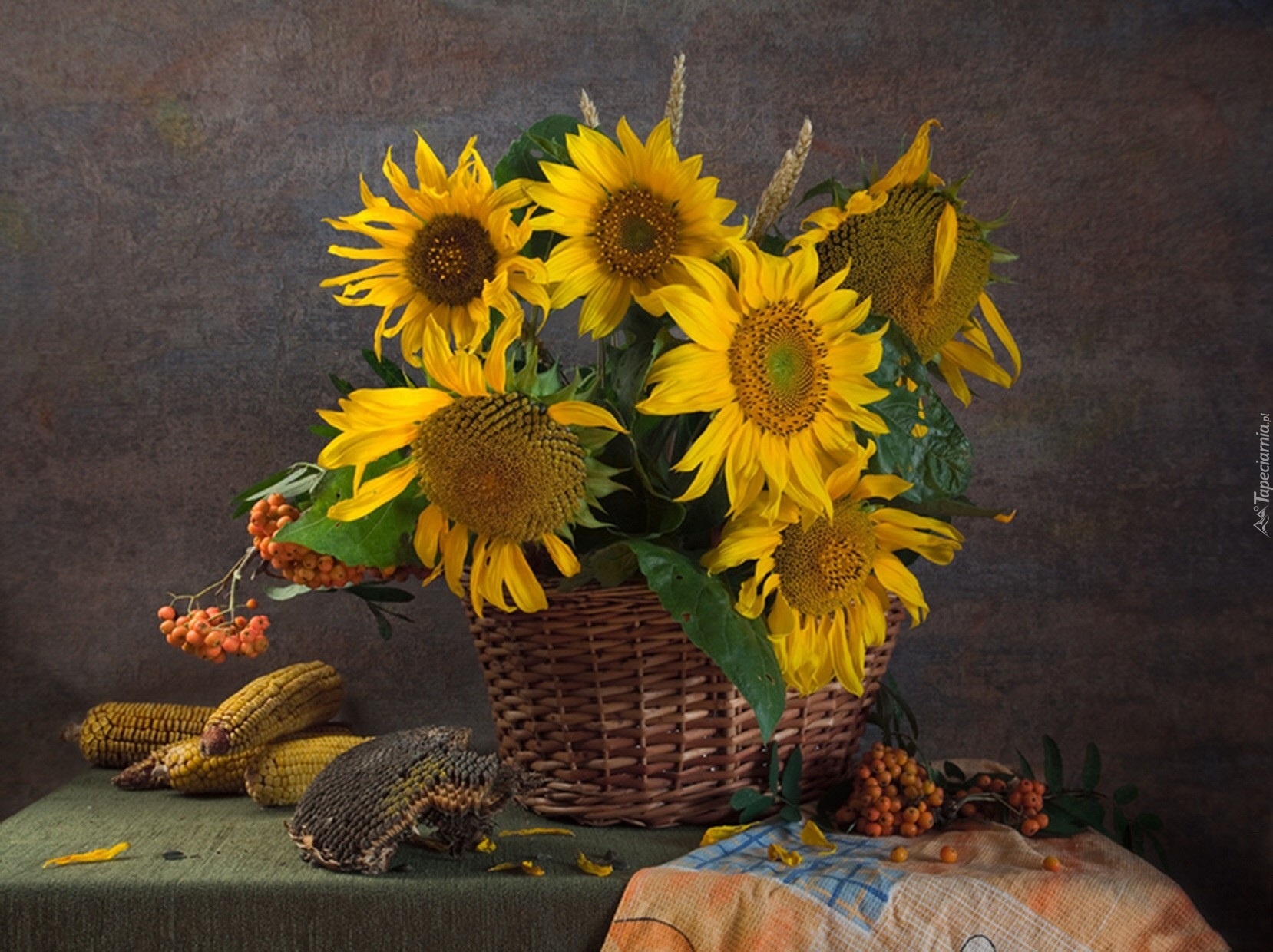 Edytor tapety: Kosz, Wiklinowy, Słoneczniki, Kukurydza