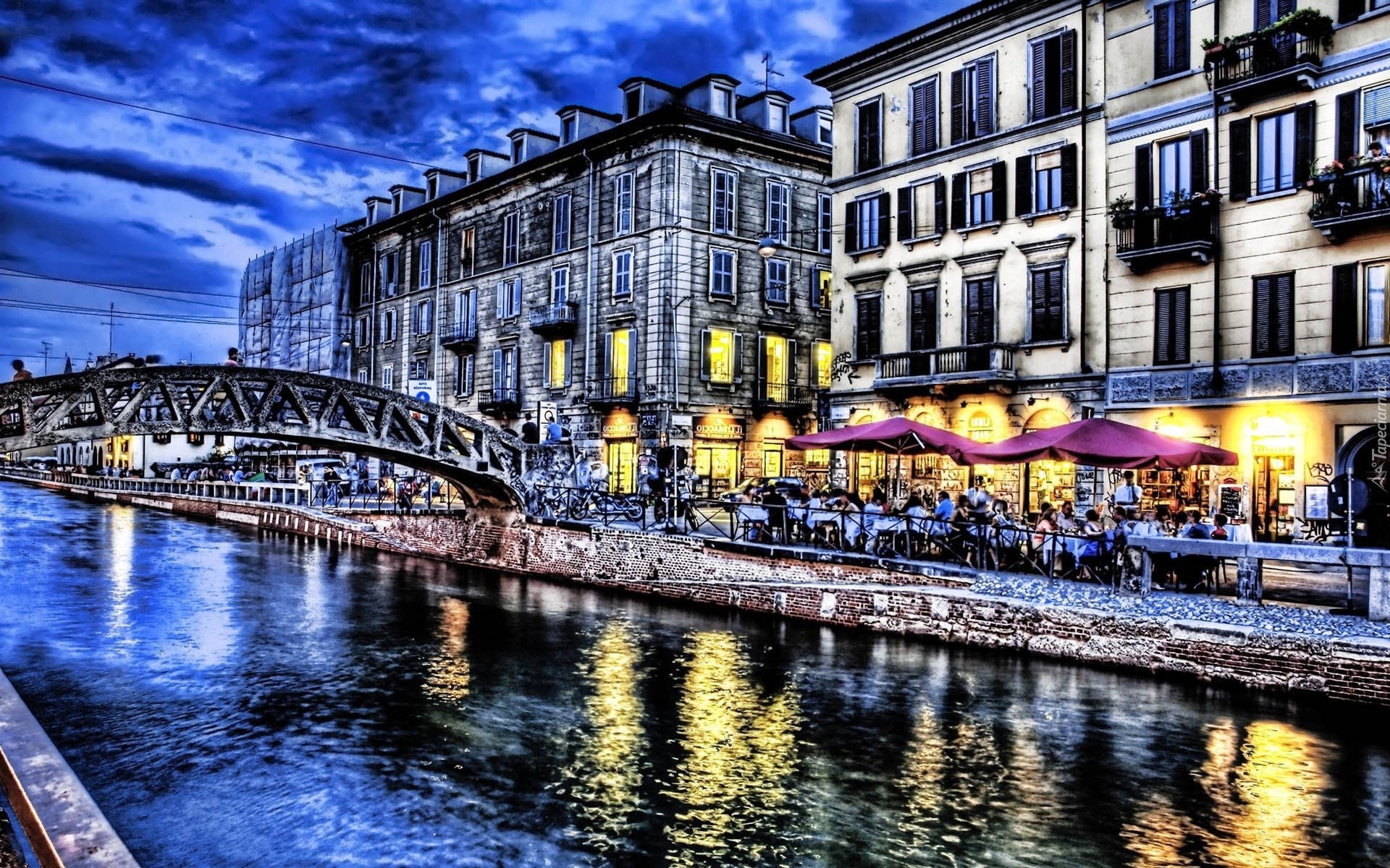 Edytor tapety: Rzeka, Most, Domy, Kawiarnia