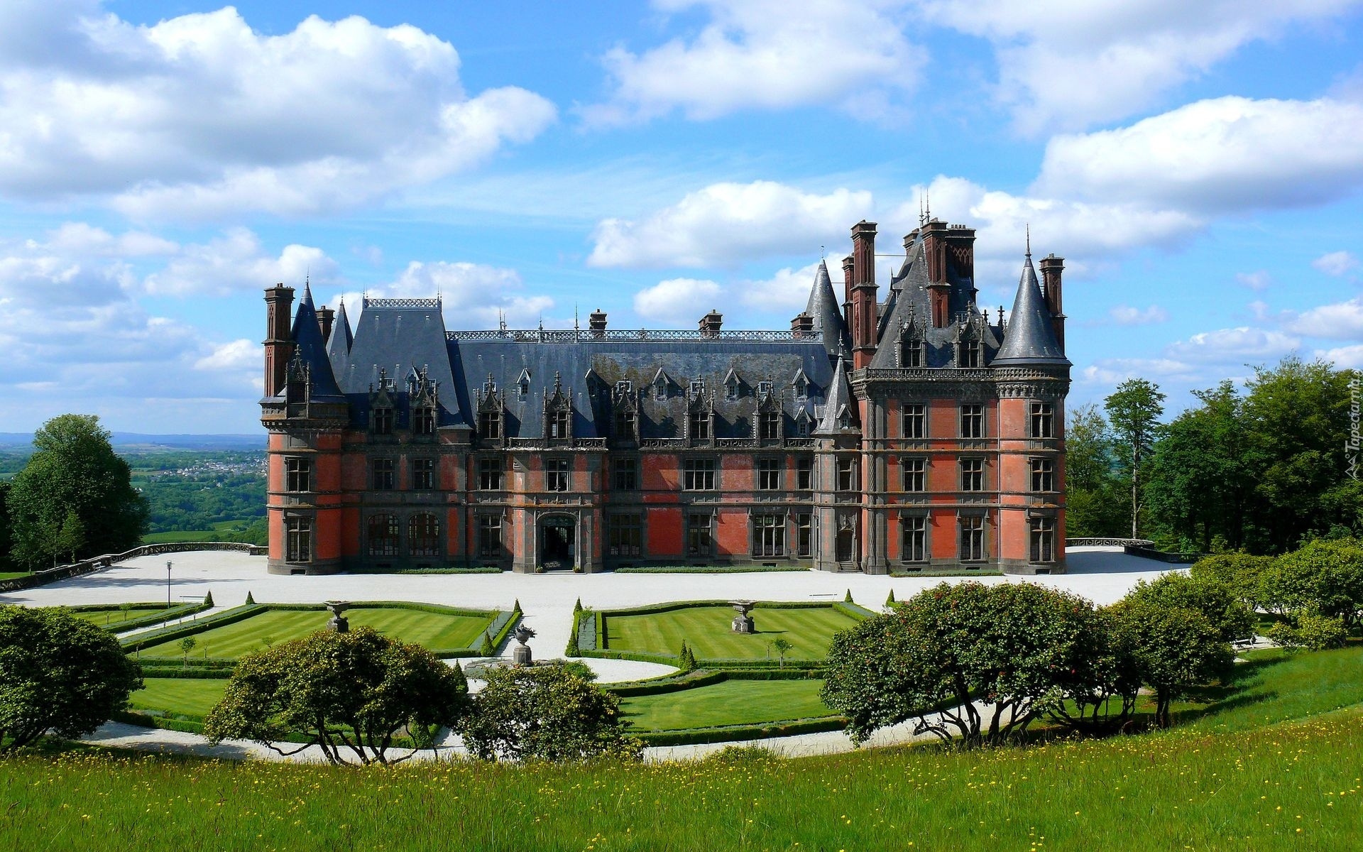 Edytor tapety: Zamek, Ogród, Drzewa, Błękitne, Niebo