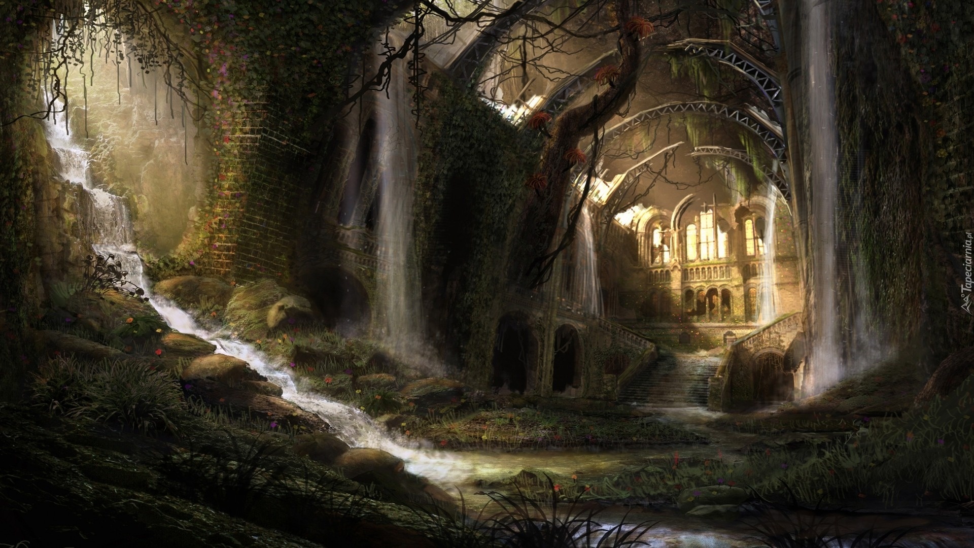 Edytor tapety: Świątynia, Spływająca, Woda, Schody