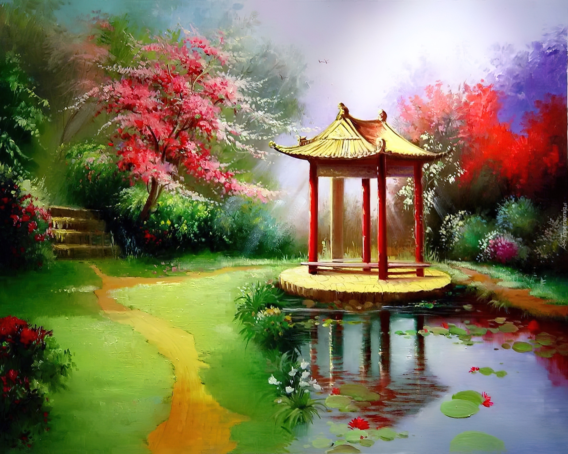 Edytor tapety: Ogród, Sadzawka, Drzewa, Ścieżka
