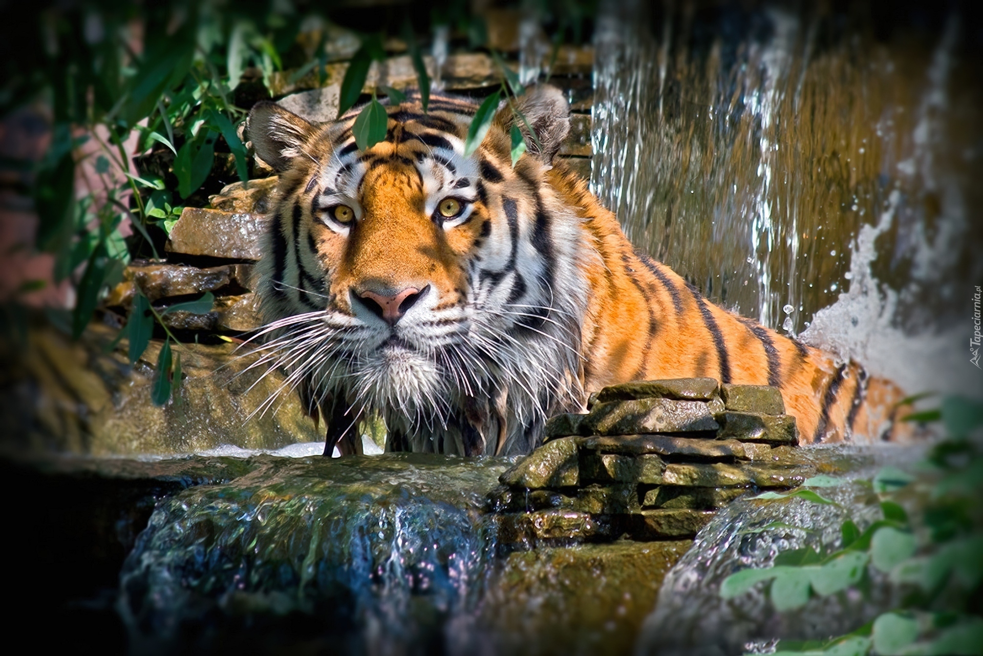 Edytor tapety: Tygrys, Woda, Strumień, Kamienie