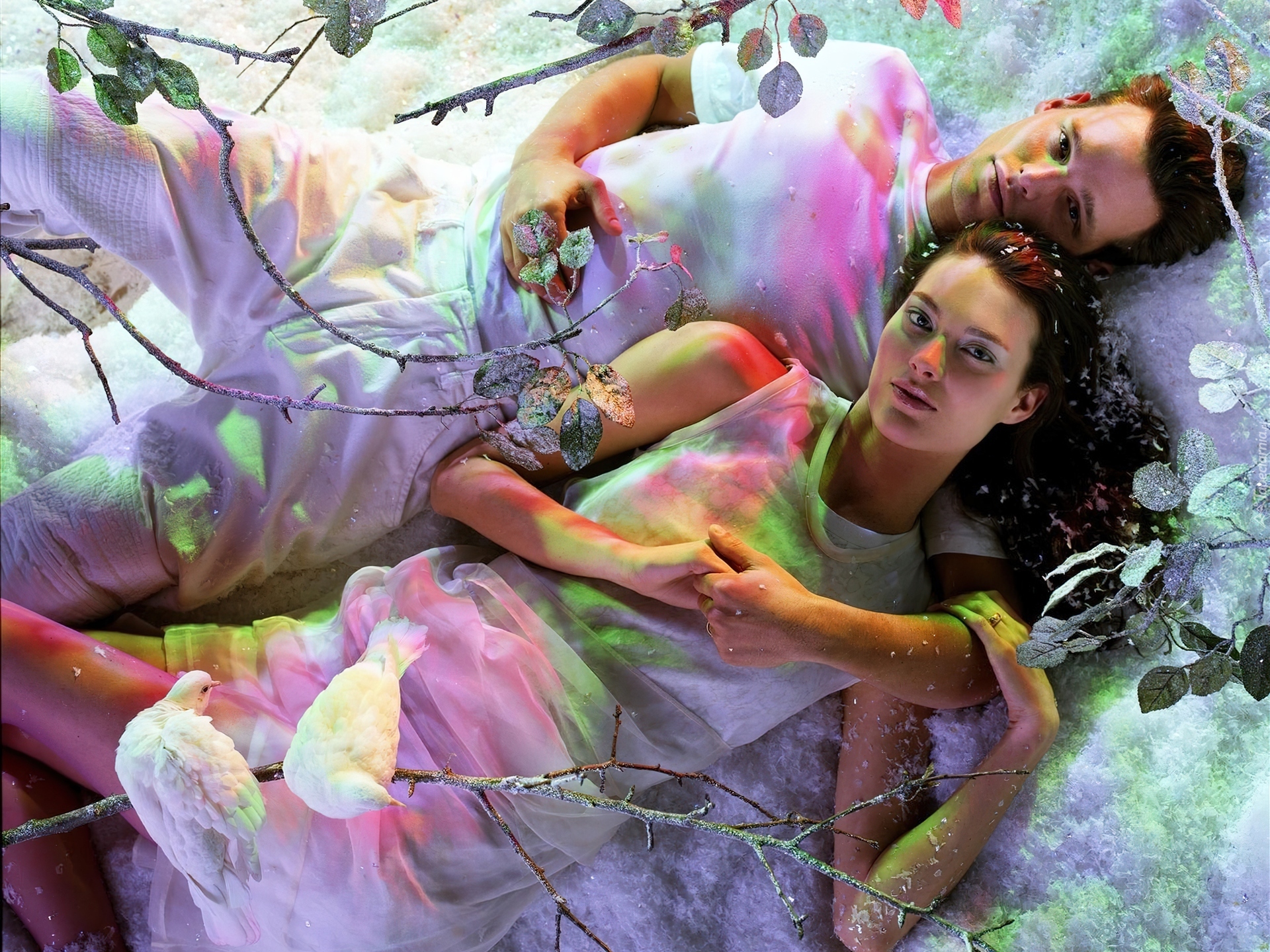 Edytor tapety: Kobieta, Mężczyzna, Ptaki, Płatki, Śniegu