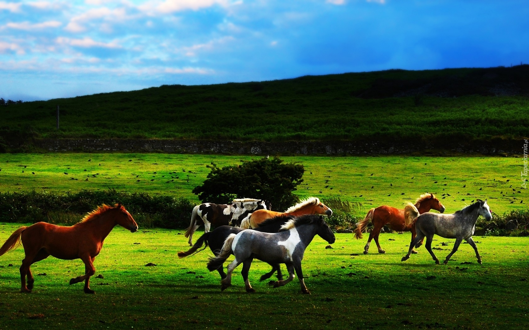 Edytor tapety: Konie, Galop, Pastwisko, Wzgórze