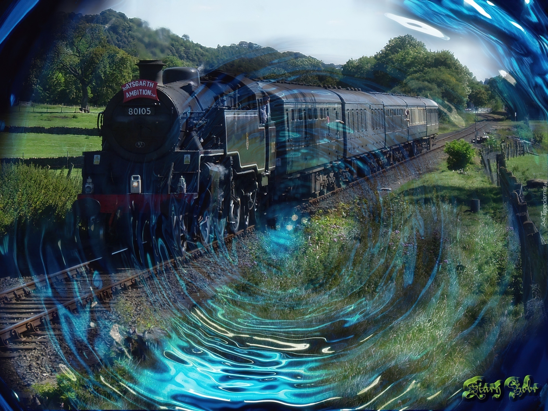 Edytor tapety: Pociąg, Wagony, Tory, Woda