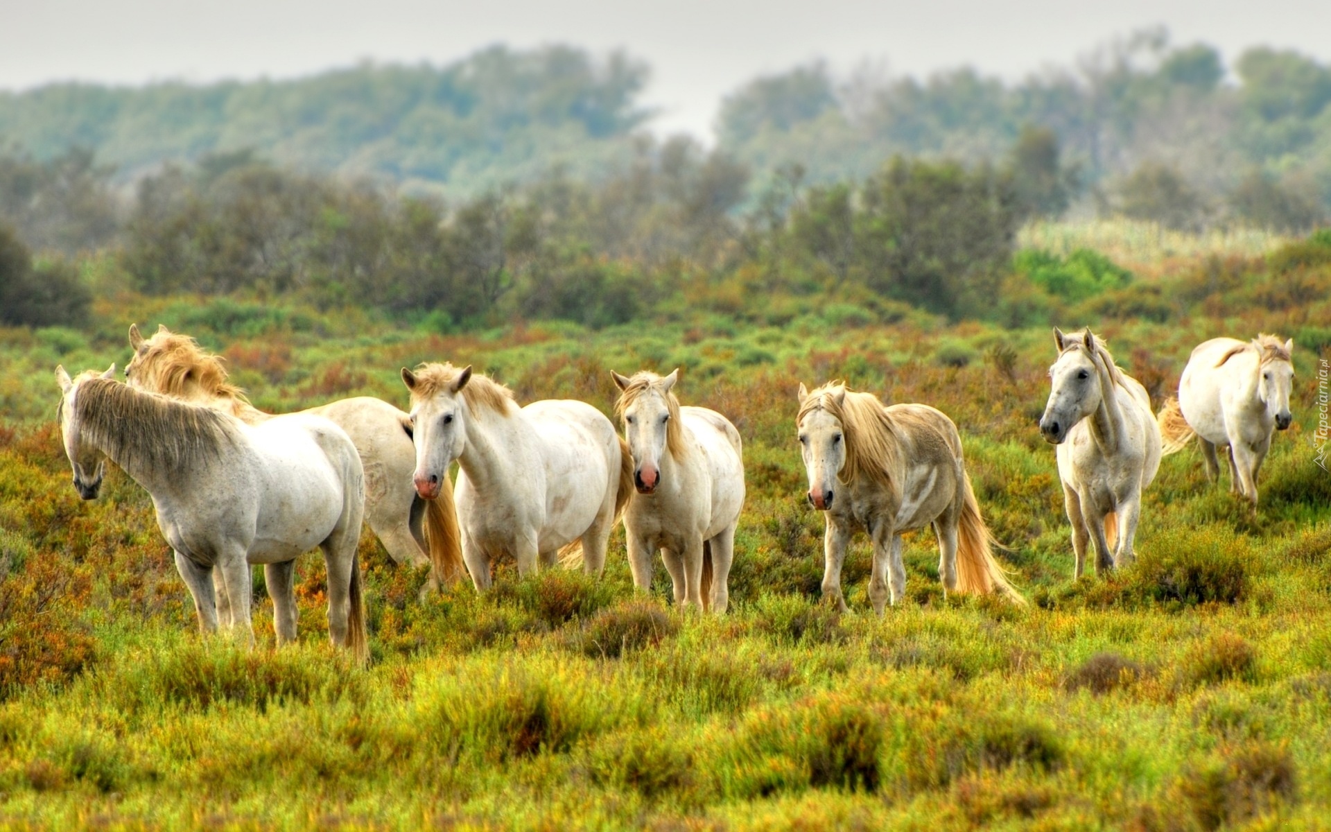 Edytor tapety: Białe, Konie, Stado, Łąka