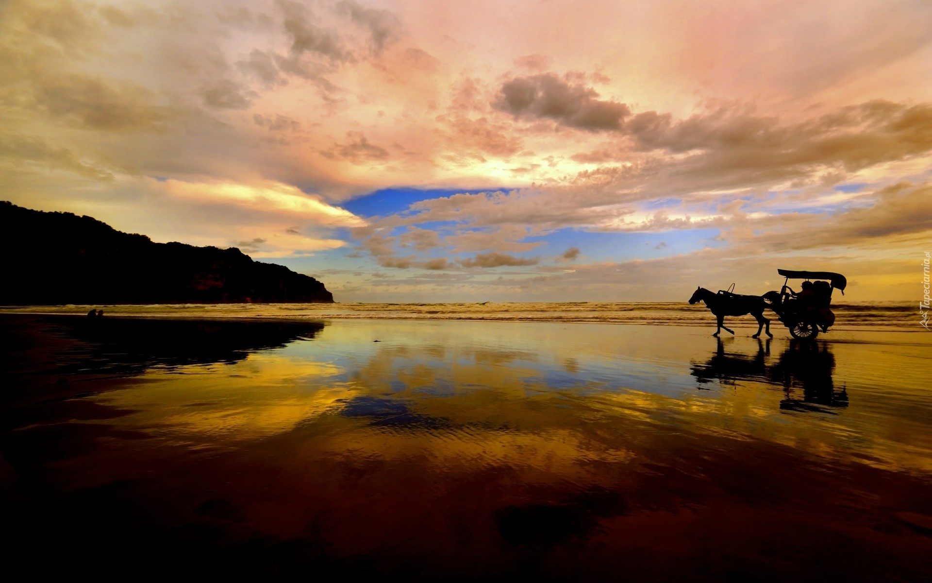 Edytor tapety: Plaża, Zachód, Słońca, Koń, Wózek