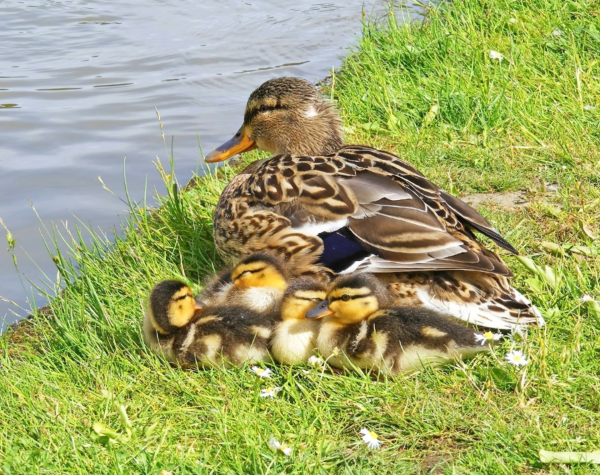 Edytor tapety: Kaczka, Pisklaki, Staw, Trawa