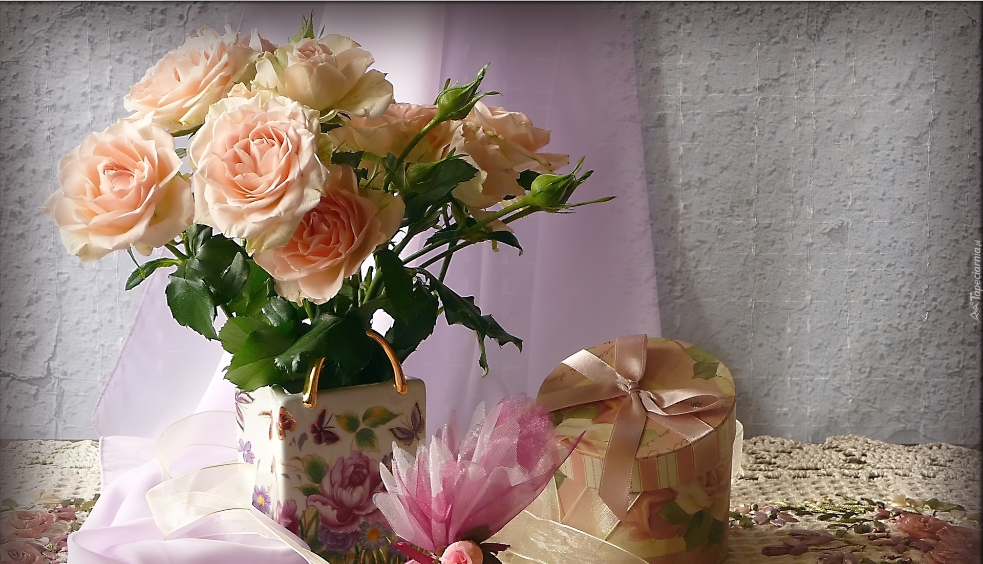 Edytor tapety: Wazon, Róże, Pudełeczko
