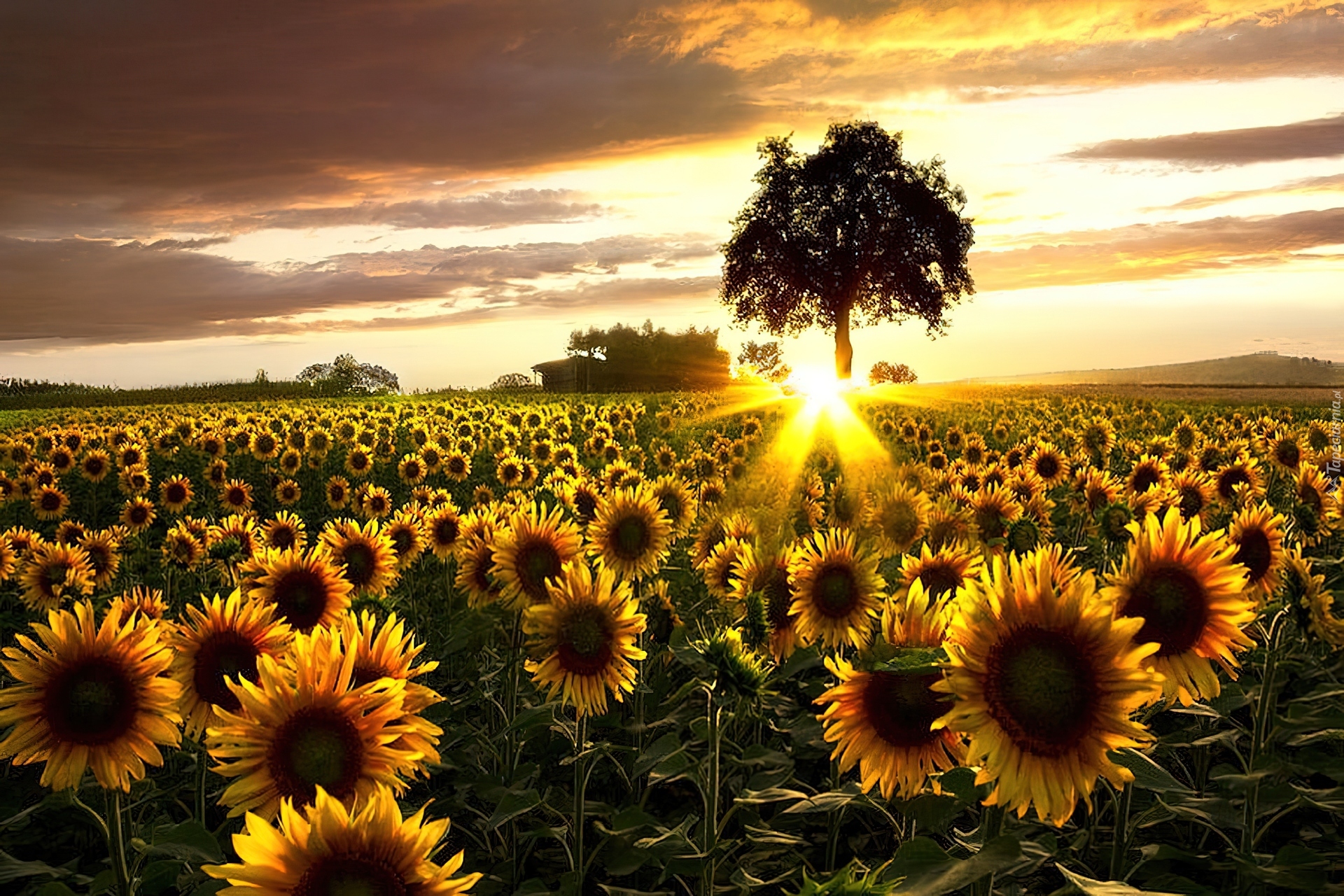 Edytor tapety: Słoneczniki, Zachód Słońca, Drzewo, Promienie