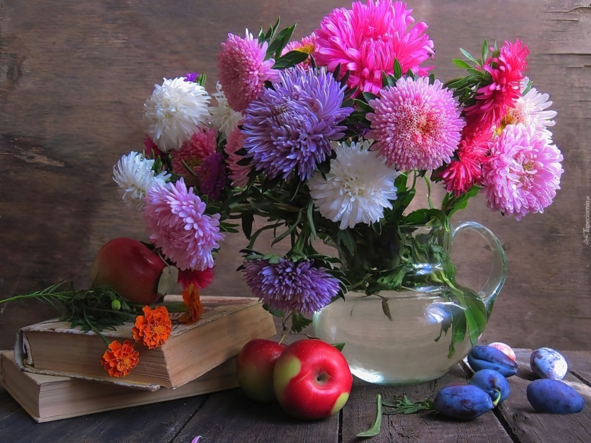 Edytor tapety: Kolorowe, Astry, Śliwki, Jabłka, Książki