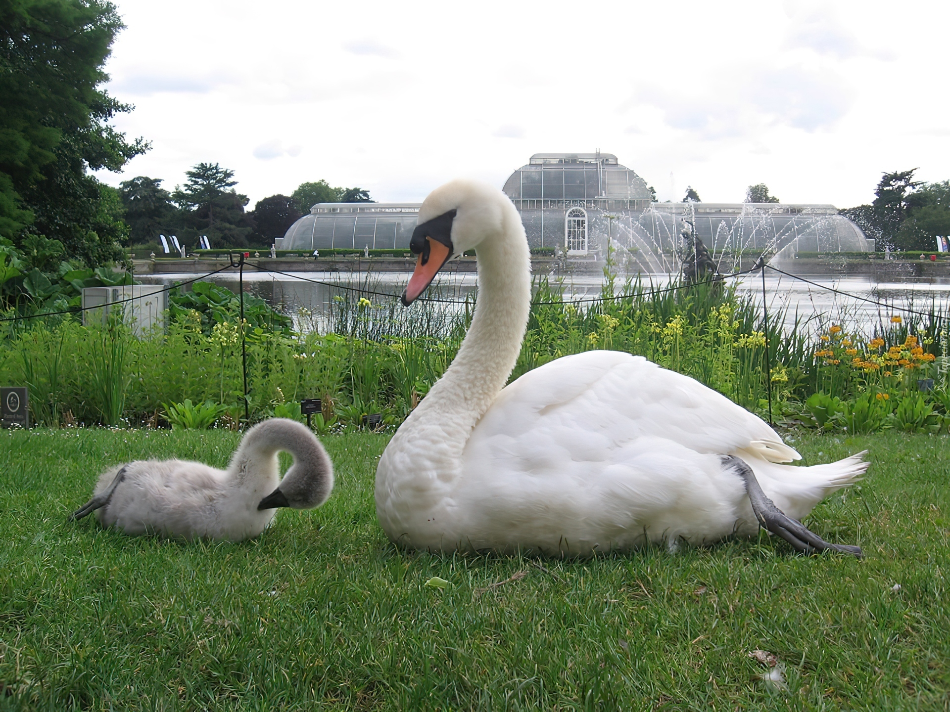 Edytor tapety: Dwa, Łabędzie, Trawa, Fontanna