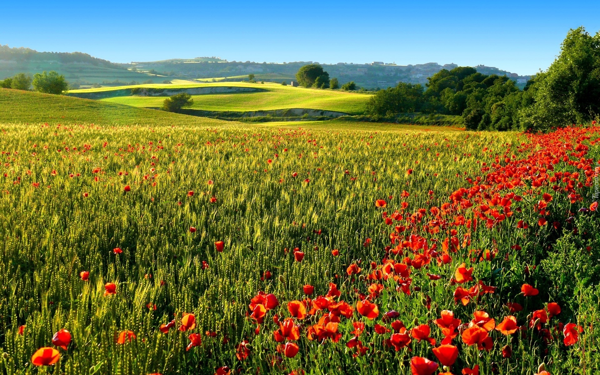 Edytor tapety: Pole, Kłosy, Czerwone, Maki, Wzgórza, Drzewa