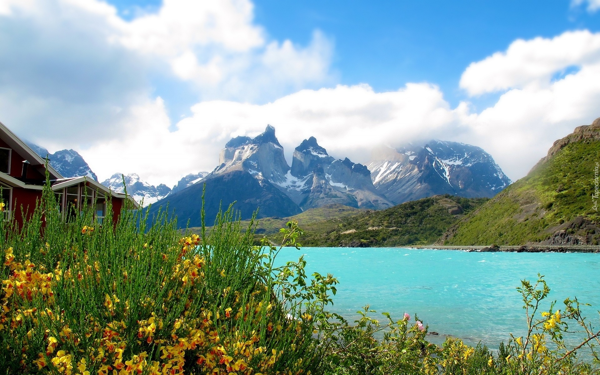 Edytor tapety: Góry, Błękitne, Jezioro, Żółte, Kwiaty