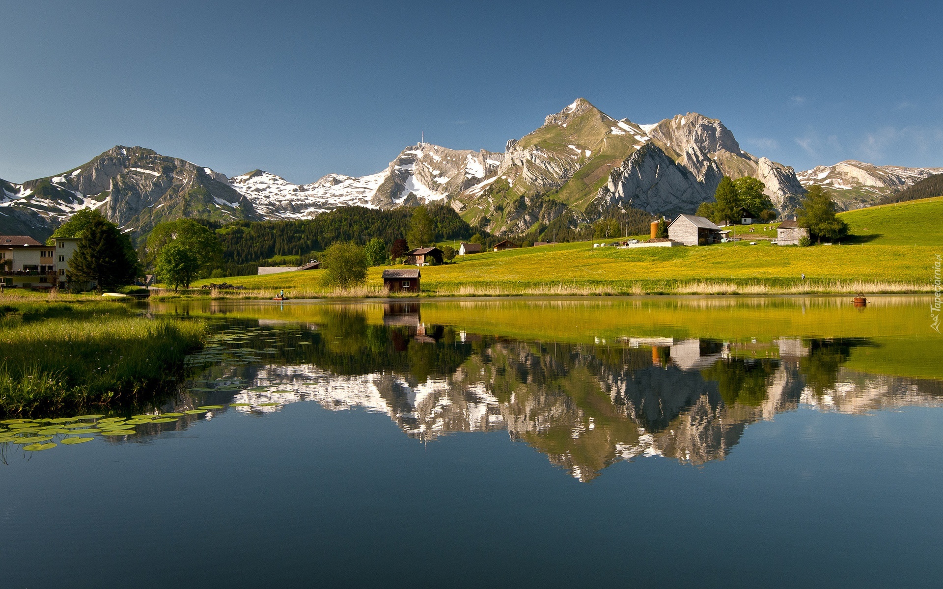 Edytor tapety: Góry, Jezioro, Domy, Odbicie