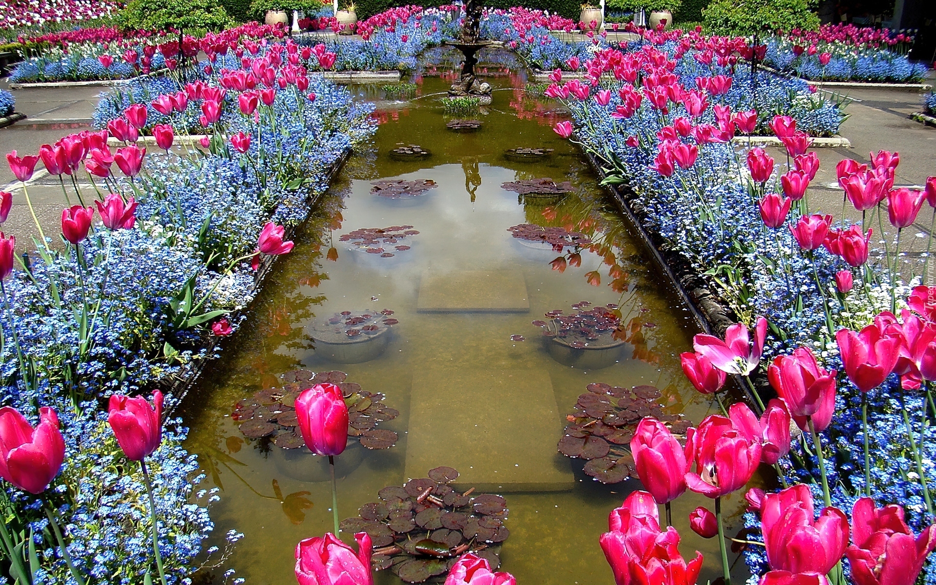 Edytor tapety: Fontanna, Różowe, Tulipany, Niebieskie, Niezapominajki