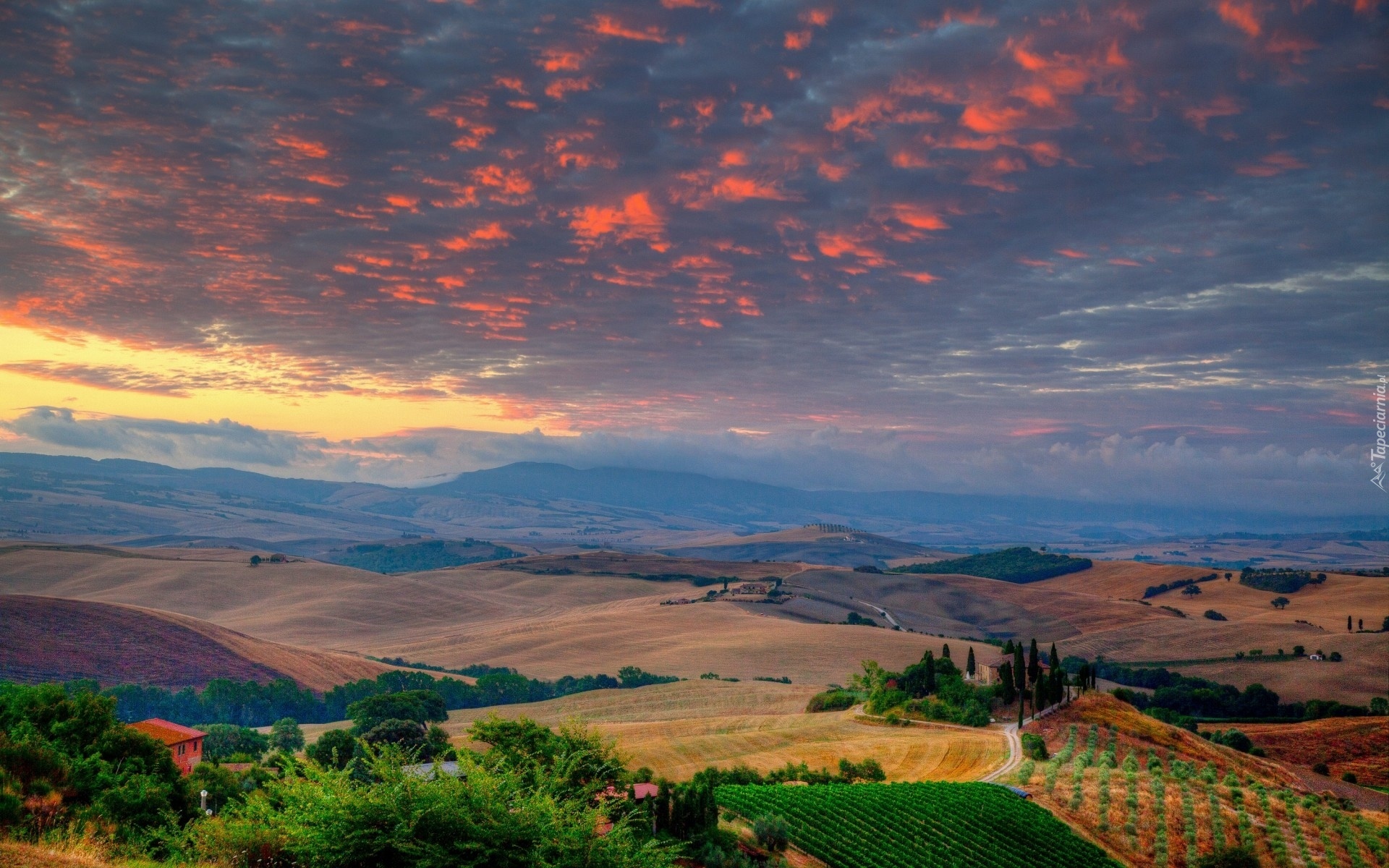 Edytor tapety: Zachód, Słońca, Pola, Wzgórza, Toskania