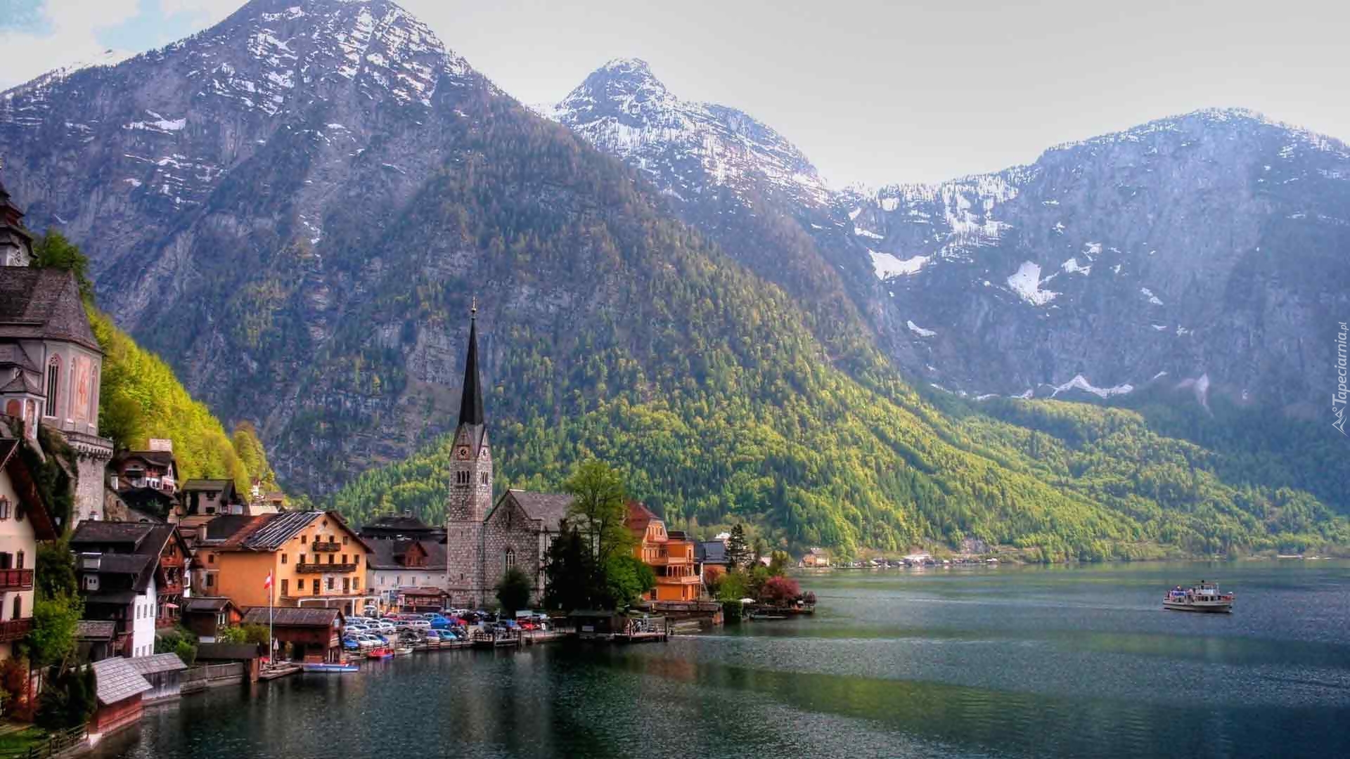 Edytor tapety: Austria, Góry Alpy Salzburskie, Miasteczko Hallstatt, Jezioro Hallstättersee, Kościół, Domy