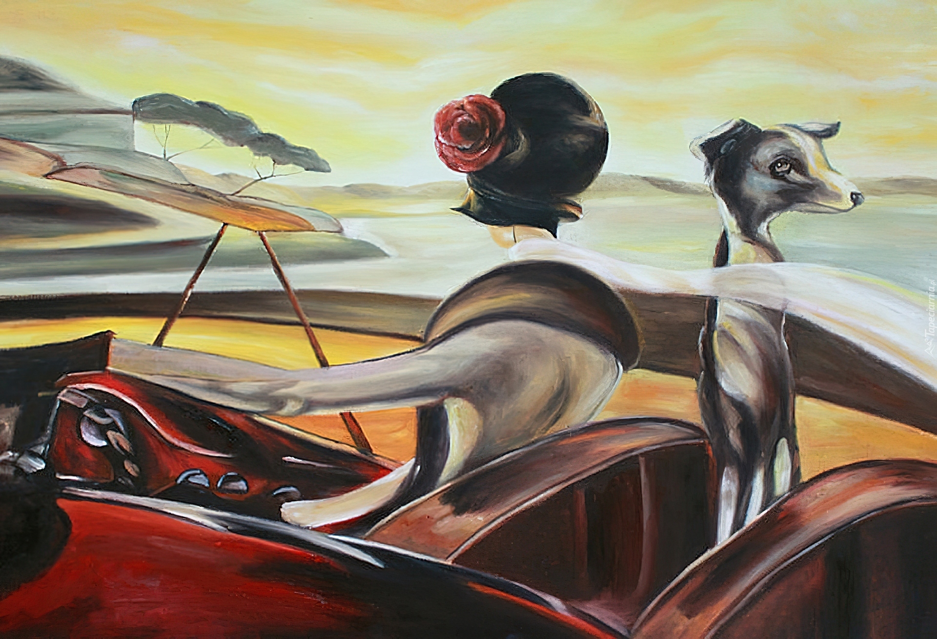 Edytor tapety: Obraz, Samochód, Przejażdżka, Kobieta, Pies