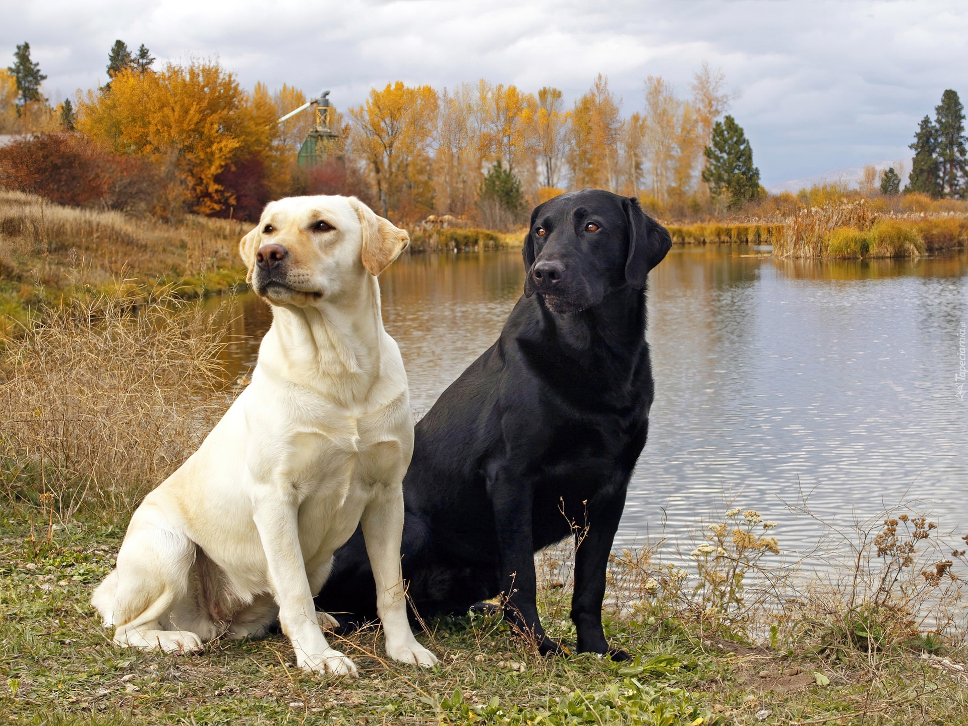 Edytor tapety: Dwa, Psy, Labradory, Jezioro