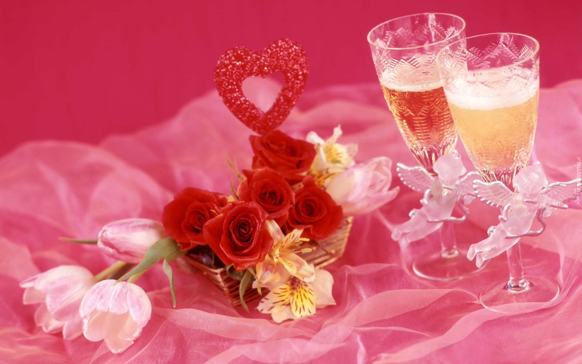 Edytor tapety: Szampan, Kielszki, Kwiaty, Serce